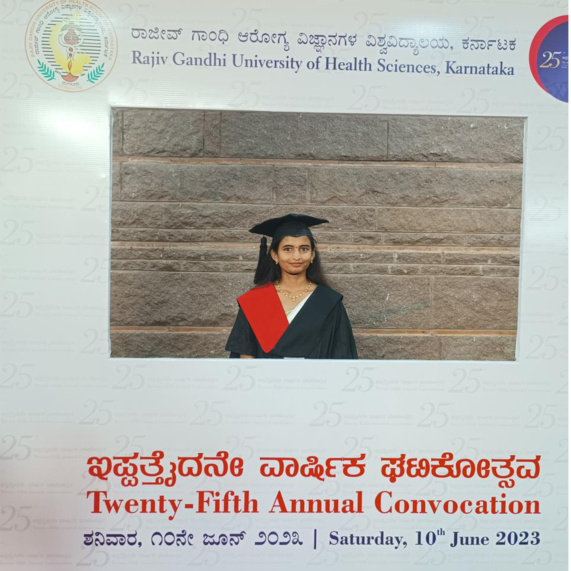 Dr. Vasundhara S, has secured Gold medal in her final year BAMS with 80.86%; 2nd rank in Panchakarma with 85%(150/175); 5th rank in Shalya Tantra with 82%(288/350). In her third year BAMS, she has got 1st rank in Kaumarabrithya with 86%(152/175); 6th rank in Agada tantra with 80%(140/175); 10th rank in Prasuti tantra with 79%(279/350). In her first year BAMS, she has secured 8th rank in Astanga Hrudaya with 76%(114/150).